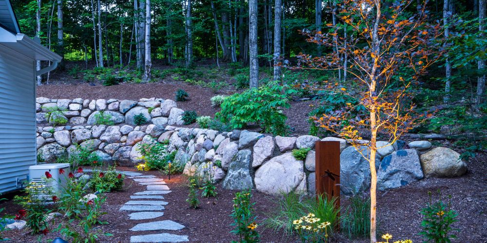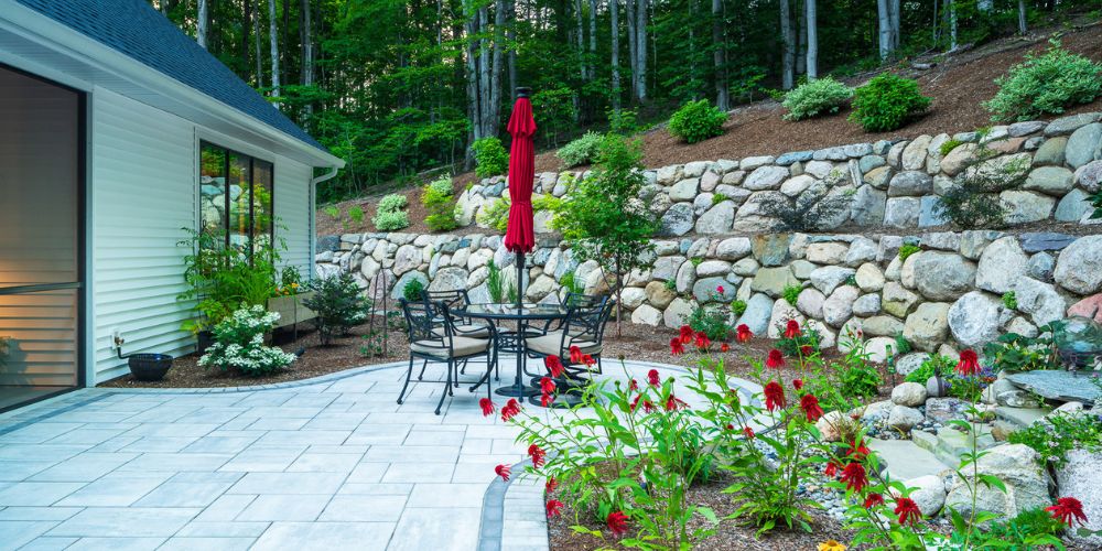 By the time the project was complete, the transformation was nothing short of dramatic. A once-steep and difficult site had been reshaped into a safe, welcoming, and beautifully crafted outdoor space. The homeowners now have flat areas for gathering, clearly defined walkways, and a landscape that blends into the surrounding woods while providing the structure and stability needed for long-term enjoyment.